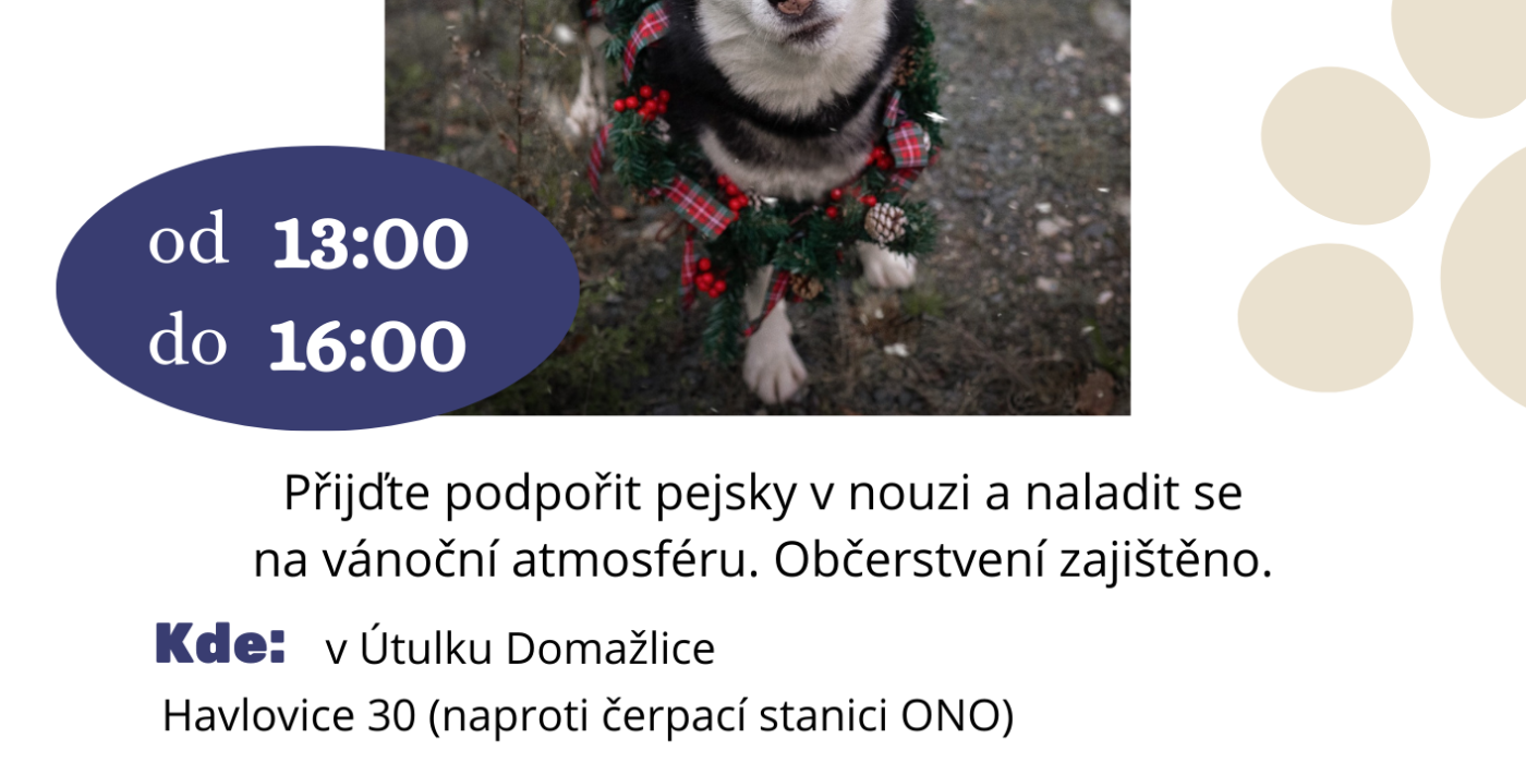 Zveme vás na tradiční Vánoce v útulku. Přijďte si užít sváteční atmosféru, pomazlit se s pejsky. Můžete jim i přinést malý dáreček pod stromeček. Společně jim zpestříme čekání na nový domov a ukážeme vám, jak se našim čtyřnohým svěřencům daří. Těšit se můžete na pejsky, vánoční atmosféru, koledy a občerstvení. Kdy a kde? Uvidíme se